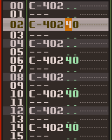 まぁとにかく、ここからが重要。ボリューム・コマンドを入力します。ライン 02 へ戻って、ノート情報の右隣(ドットが並んでいる列)にカーソルを移動させます。あなたは今、2ケタの数字が入力できるボリューム・コラムにいます。ここで、ハイハットのボリュームを一つ飛ばしに半分に設定したいので、一つ飛ばしに 40 を入力します。40? そうです、ボリューム・コラムでの最大値は 80 なので、ここでは 40 です。十の位にカーソルを置いて 4 を押さえ続けると下のように入力できます。