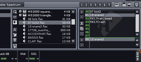 そして、少しだけバリエーションを加えます。ライン 29 と 61 のバスドラムを削除して、Track 04 の最初のラインにクラッシュ・シンバル(RX17Crash.flac)を入力しています。